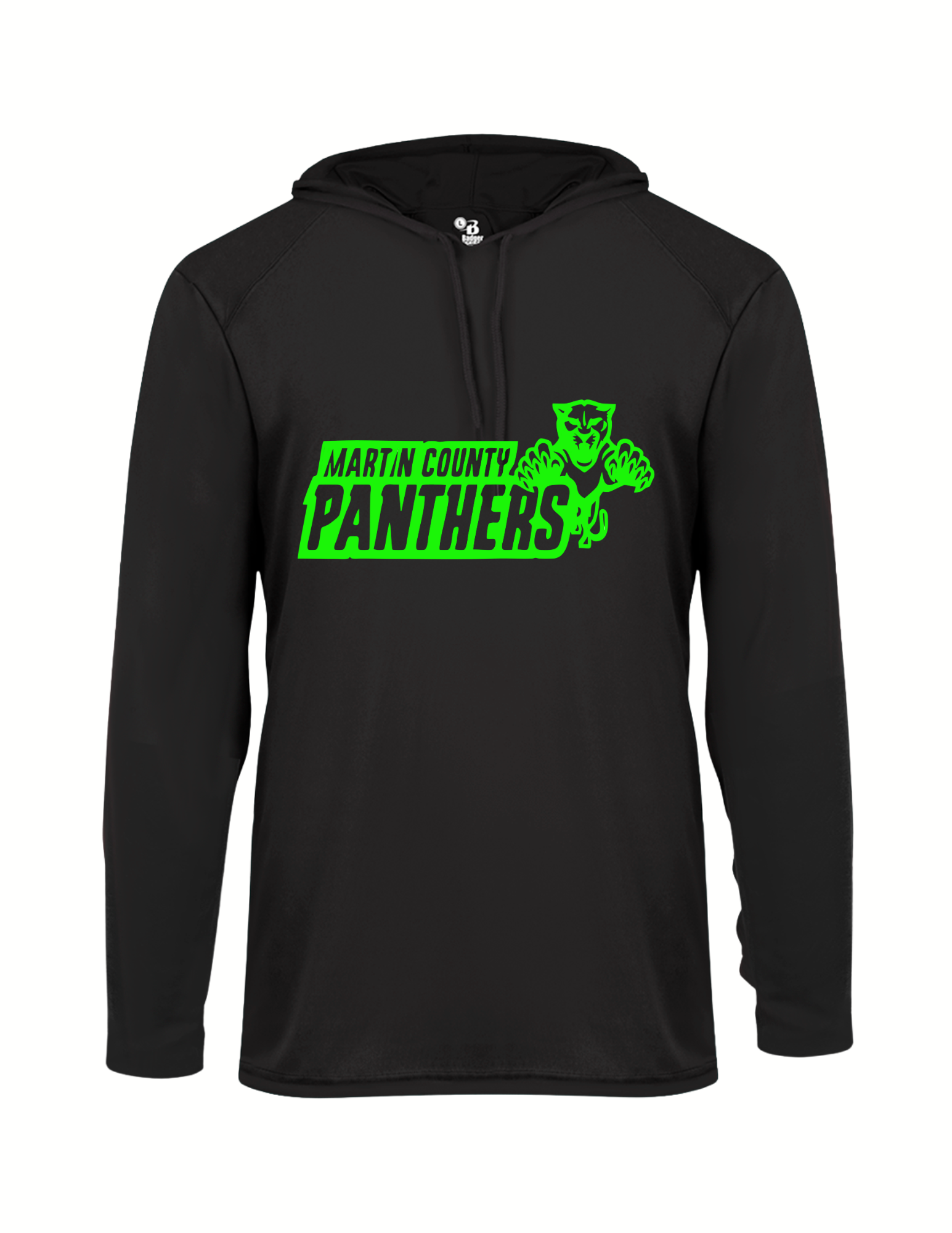 “Martin County Panthers” with pouncing panther on the chest of a dri-fit long sleeve hoodie. Available in either black or white, with a plain or glitter design, in sizes Youth XS - XL and Adult XS - 3XL.