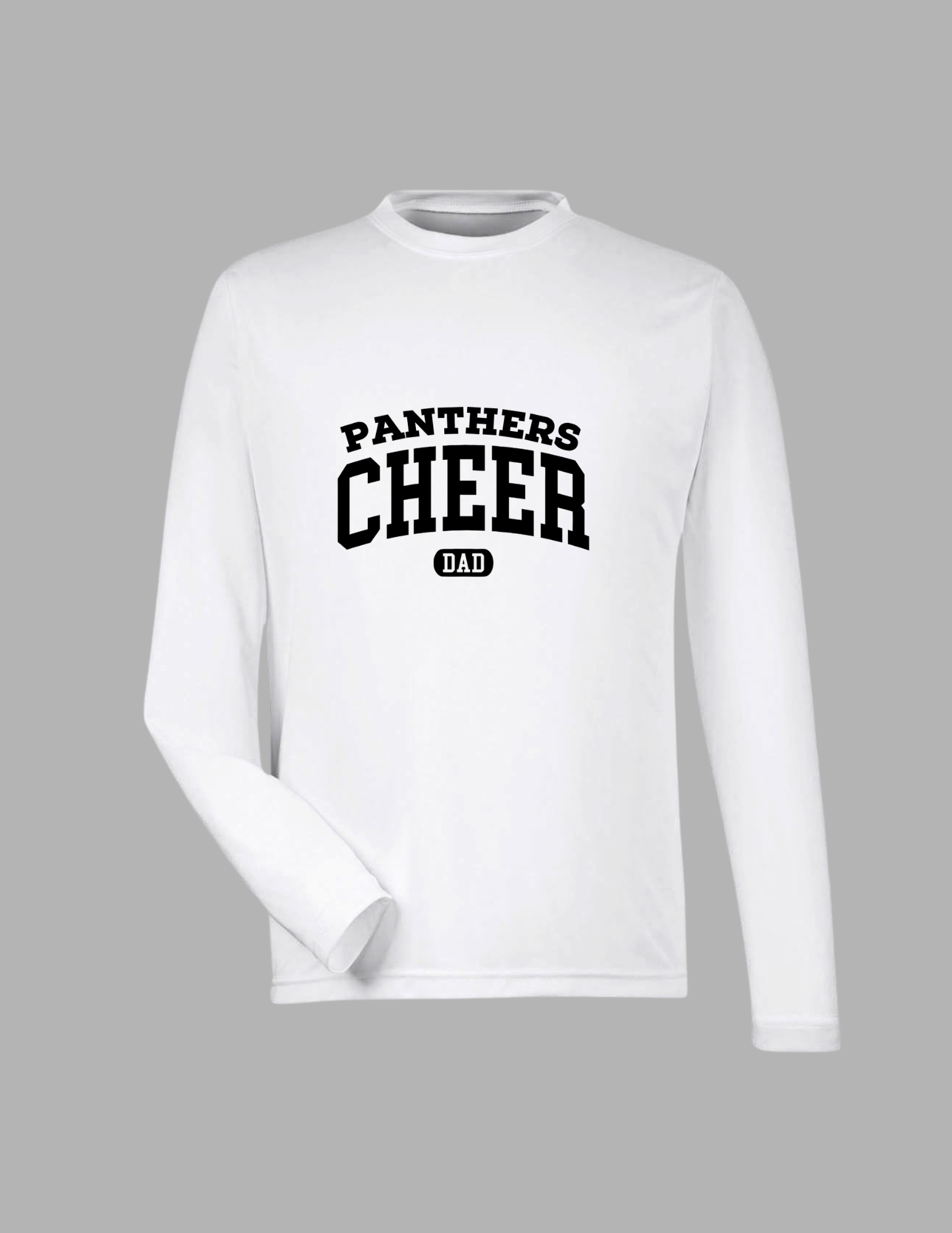 ”Panthers Cheer Dad” on the chest of a long sleeve shirt. Available in either black, white or neon green, on either a soft cotton or dri-fit shirt in sizes Youth XS - XL and Adult XS - 3XL.