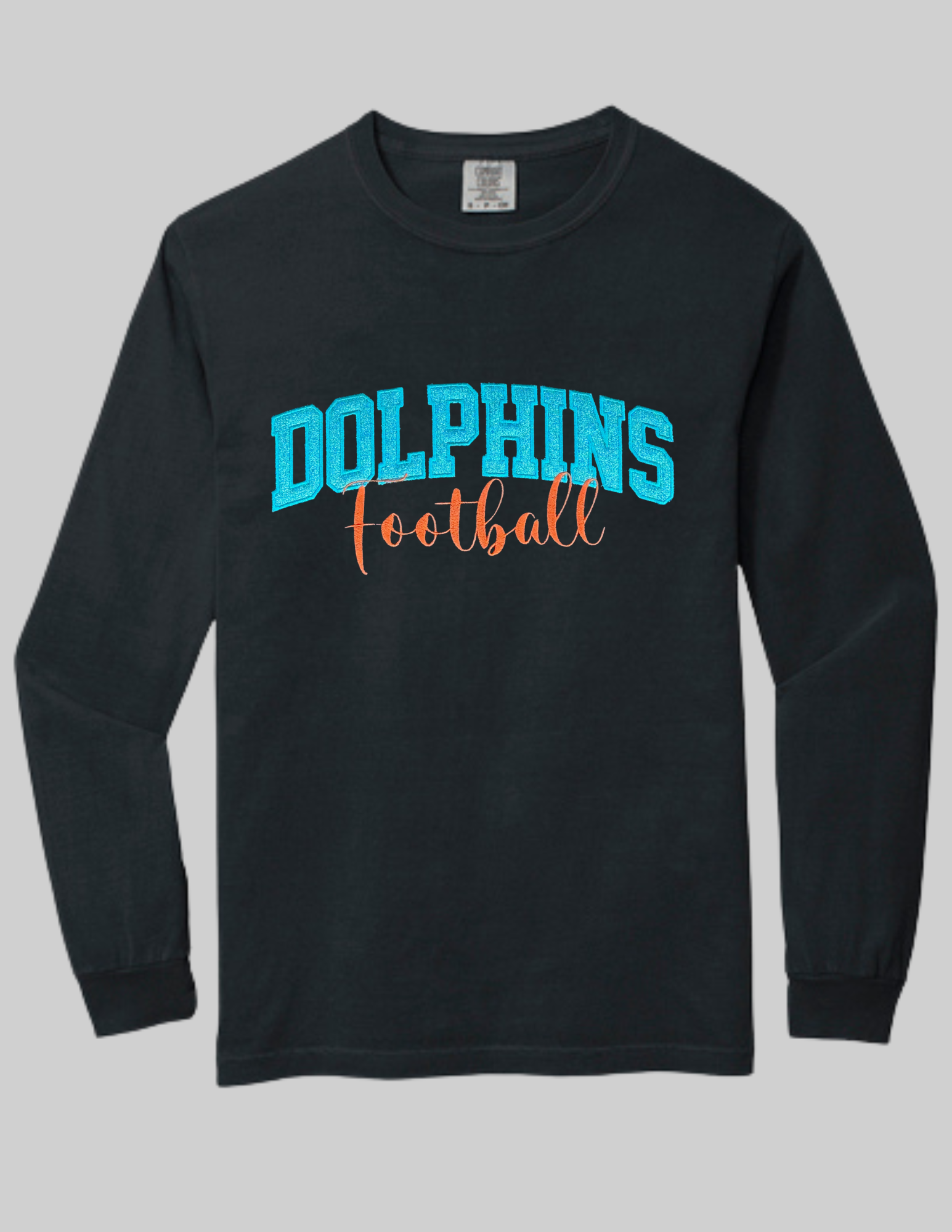 Comfort cotton long sleeve shirt with the options of either “Dolphins Cheer” or “Dolphins Football” with glitter embroidered lettering across the chest. Available in black or white in sizes Youth XS - XL and Adult Small - 3XL.