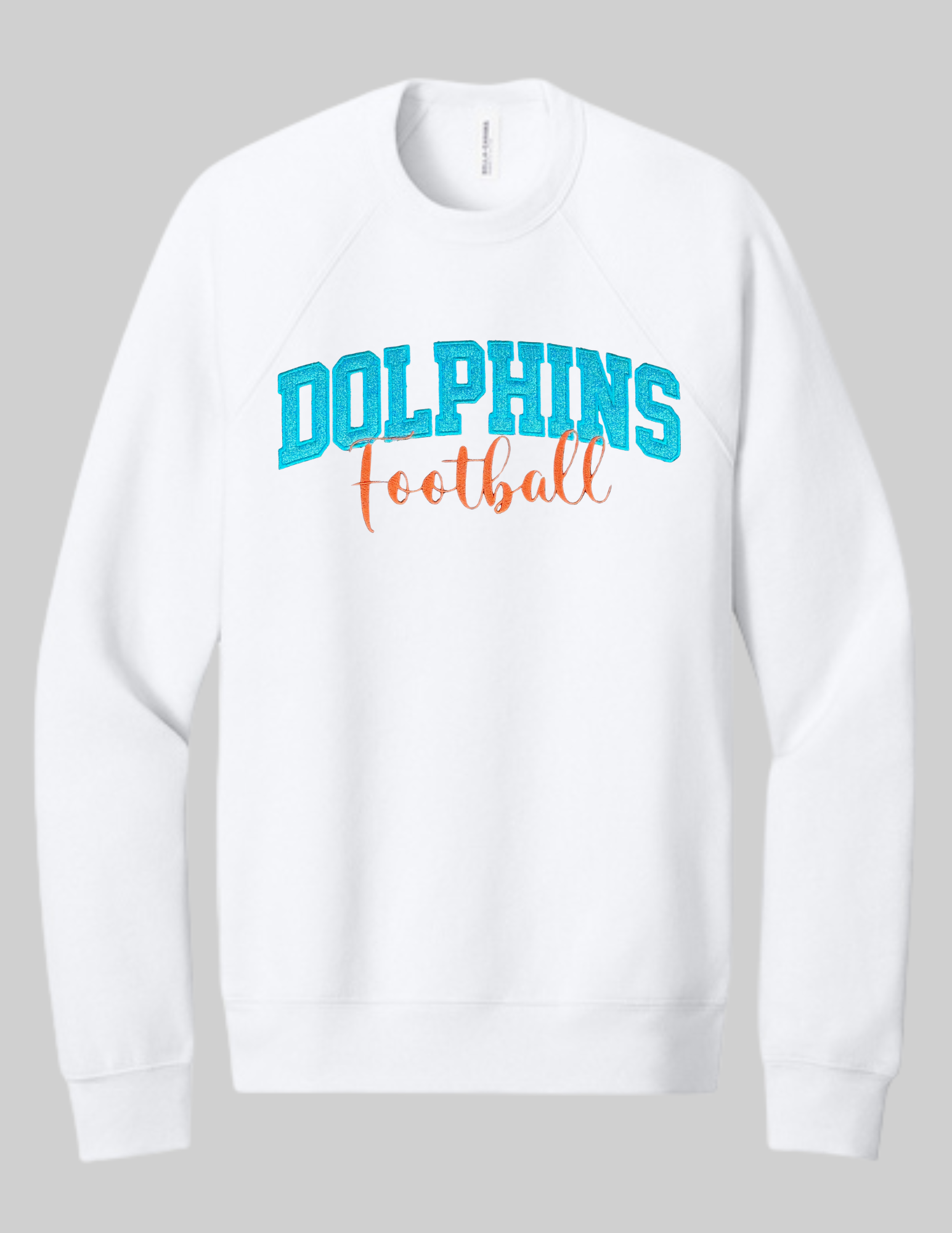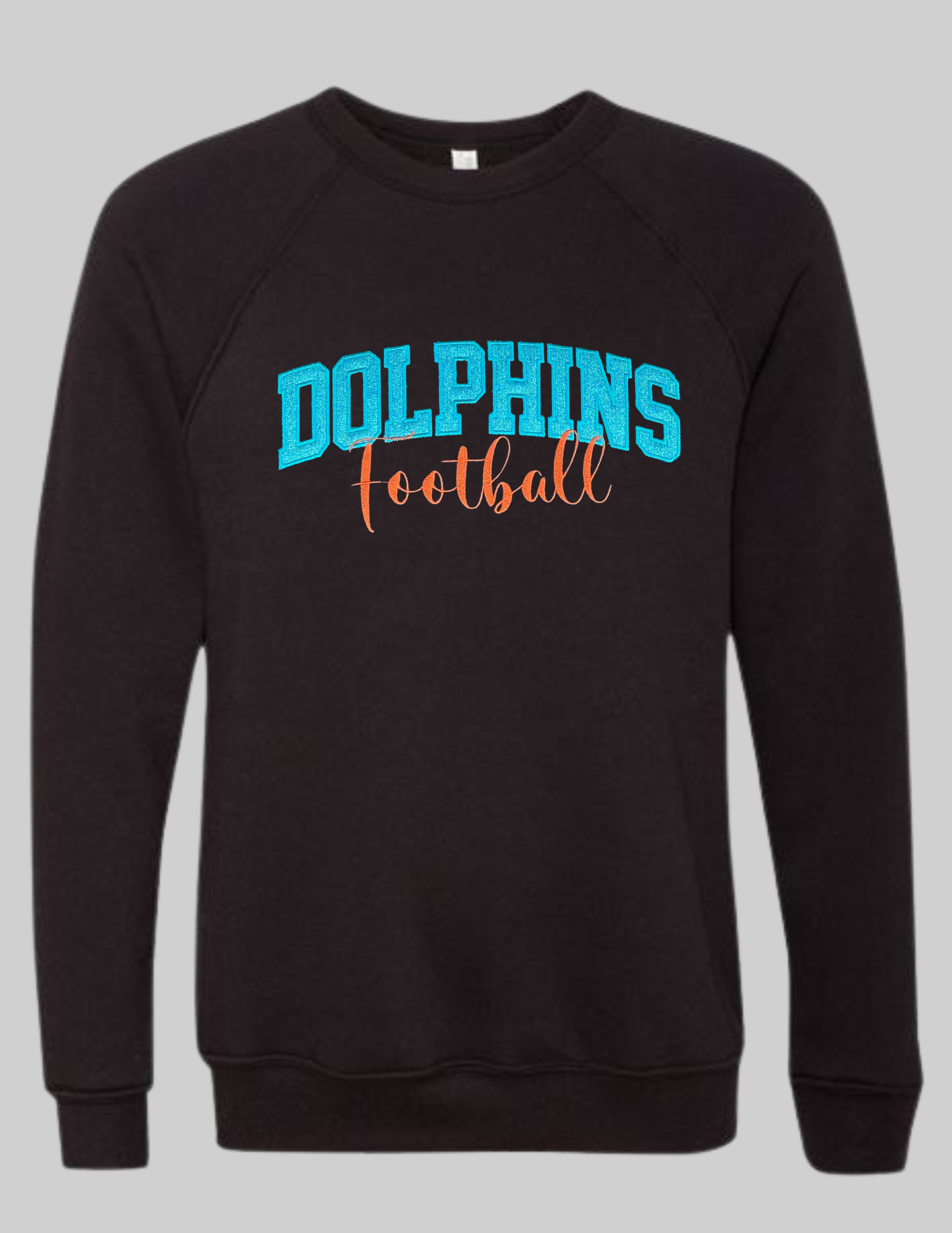 Bella crew neck sweatshirt with the options of either “Dolphins Cheer” or “Dolphins Football” with glitter embroidered lettering across the chest. Available in black or white in sizes Youth Small - Large and Adult XS - 3XL.