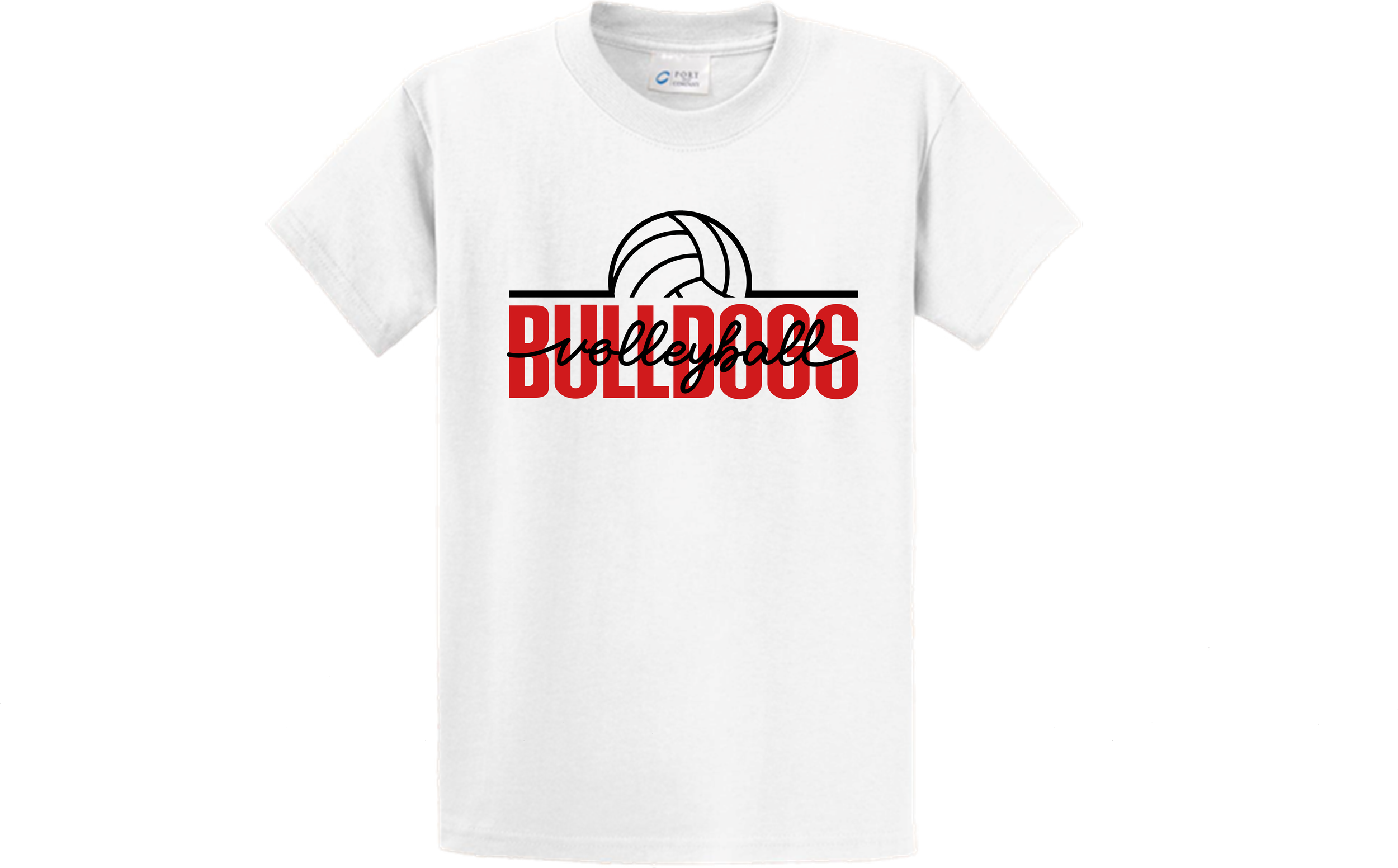 A soft cotton hoodie in white with “Bulldogs Volleyball”, and a partial volleyball in either glitter or plain design. Available in sizes youth XS - XL and Adult XS - 3XL.